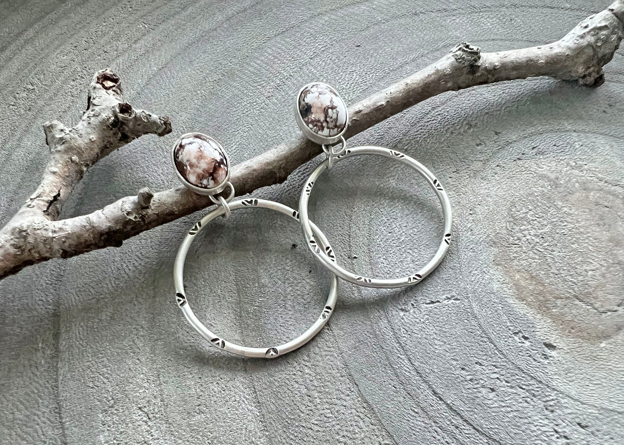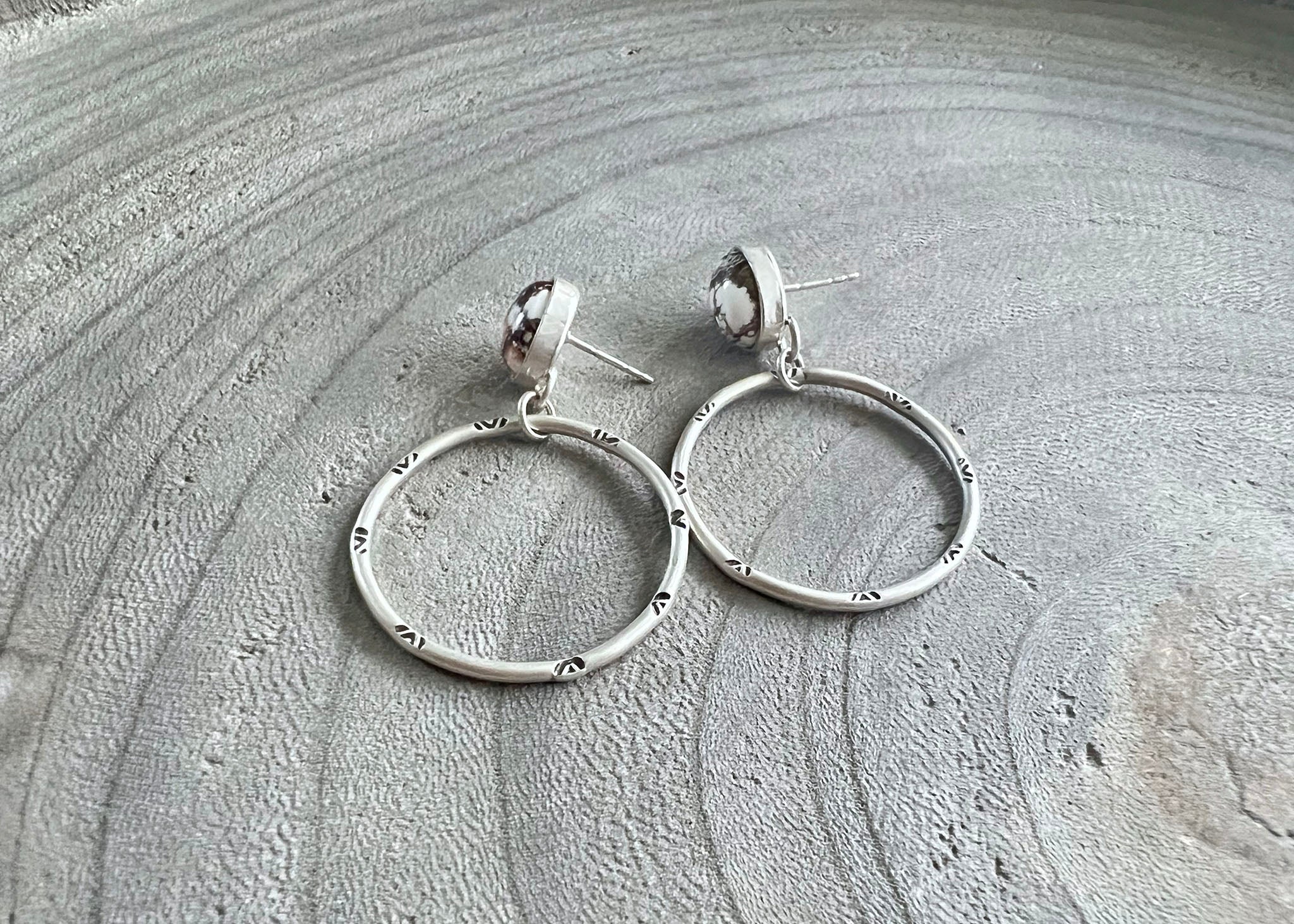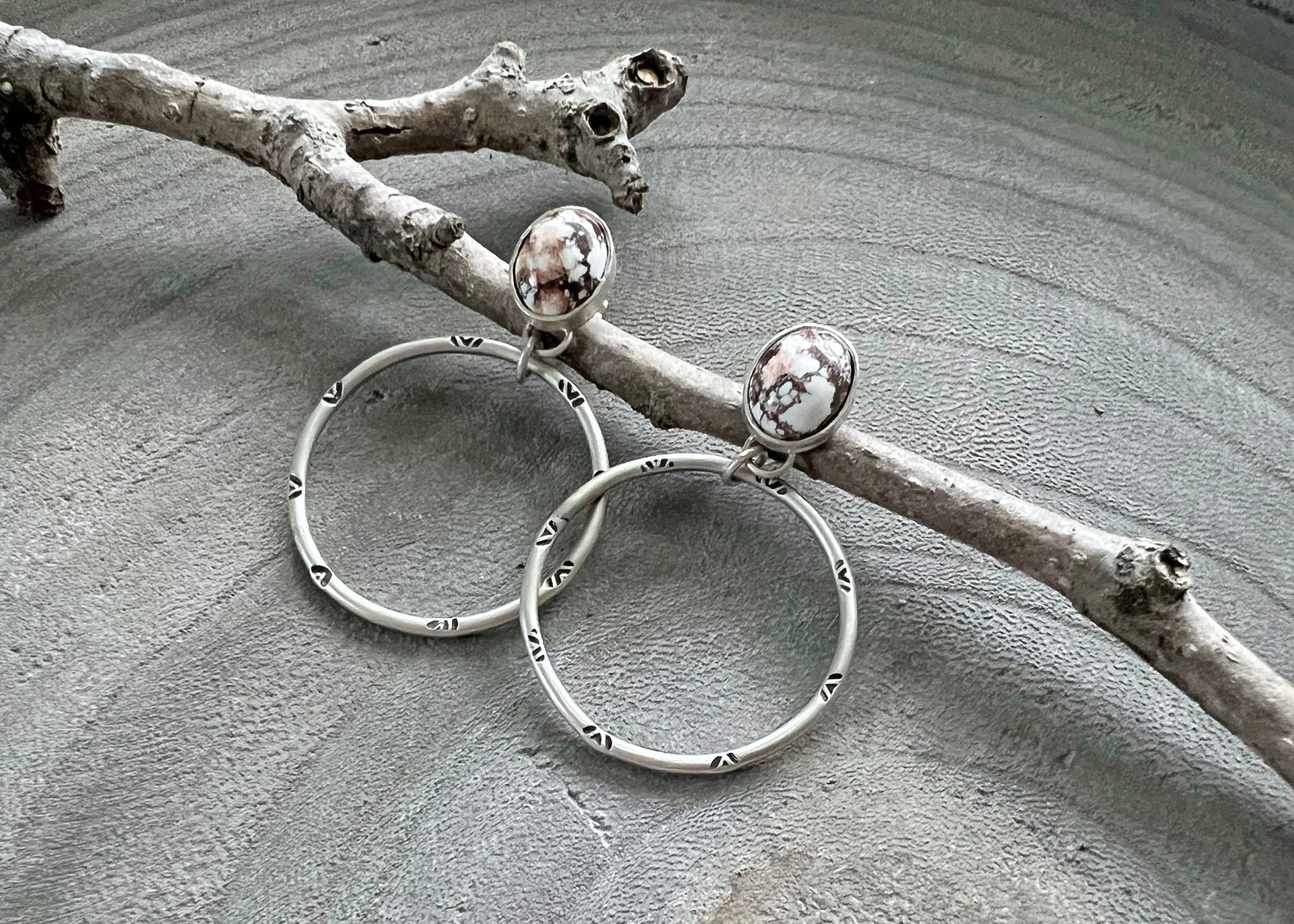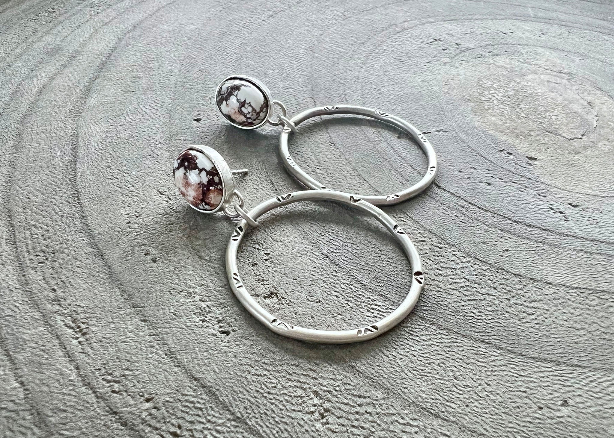 Wild horse magnesite oval cabochons are set in custom-built bezel settings. The stones show the classic variations of white, brown and peachy orange that is characteristic of wild horse. Beneath the stones are hand forged and hand stamped silver hoops. They move freely and add a bit of interest. The settings have been oxidized and tumble polished to a soft matte finish. The earrings are finished up with sterling silver posts and butterfly backs. They are lightweight and perfect for all day wear. One of a kind.